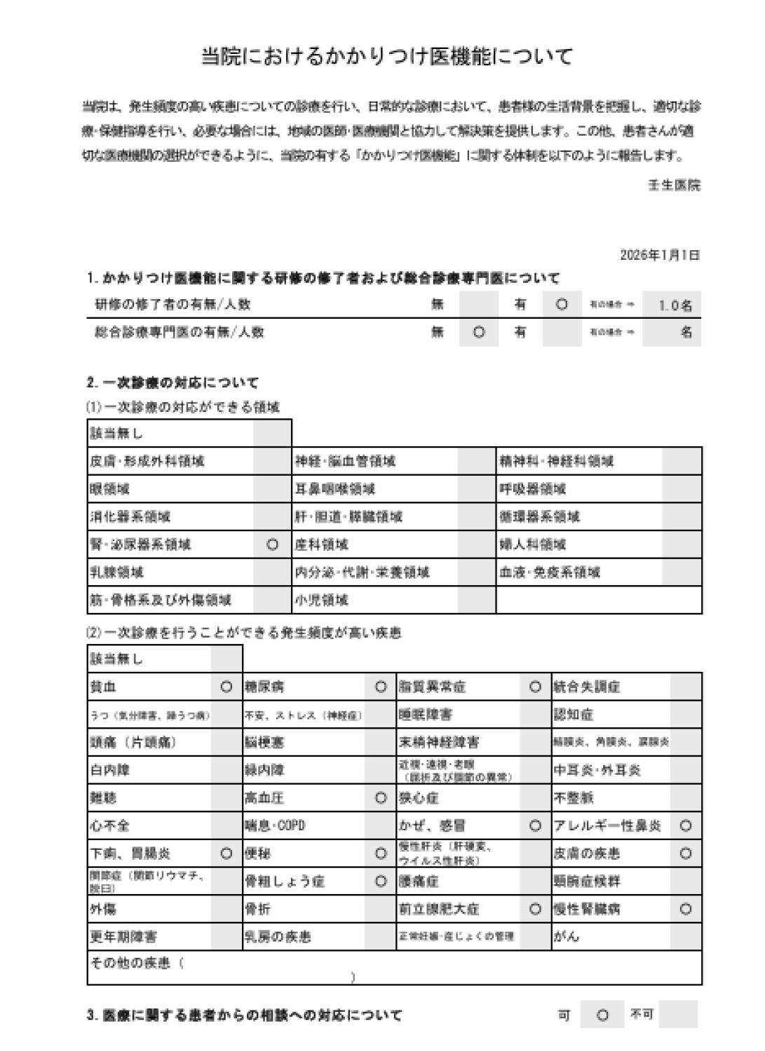 当院におけるかかりつけ医機能について壬生医院2026年2月17日https://mibuiin.com/detail.html?id=42 当院におけるかかりつけ医機能について|壬生医院当院の有する「かかりつけ医機能」に関する体制を院内に掲示しています。掲示内容はこちらの通りです。